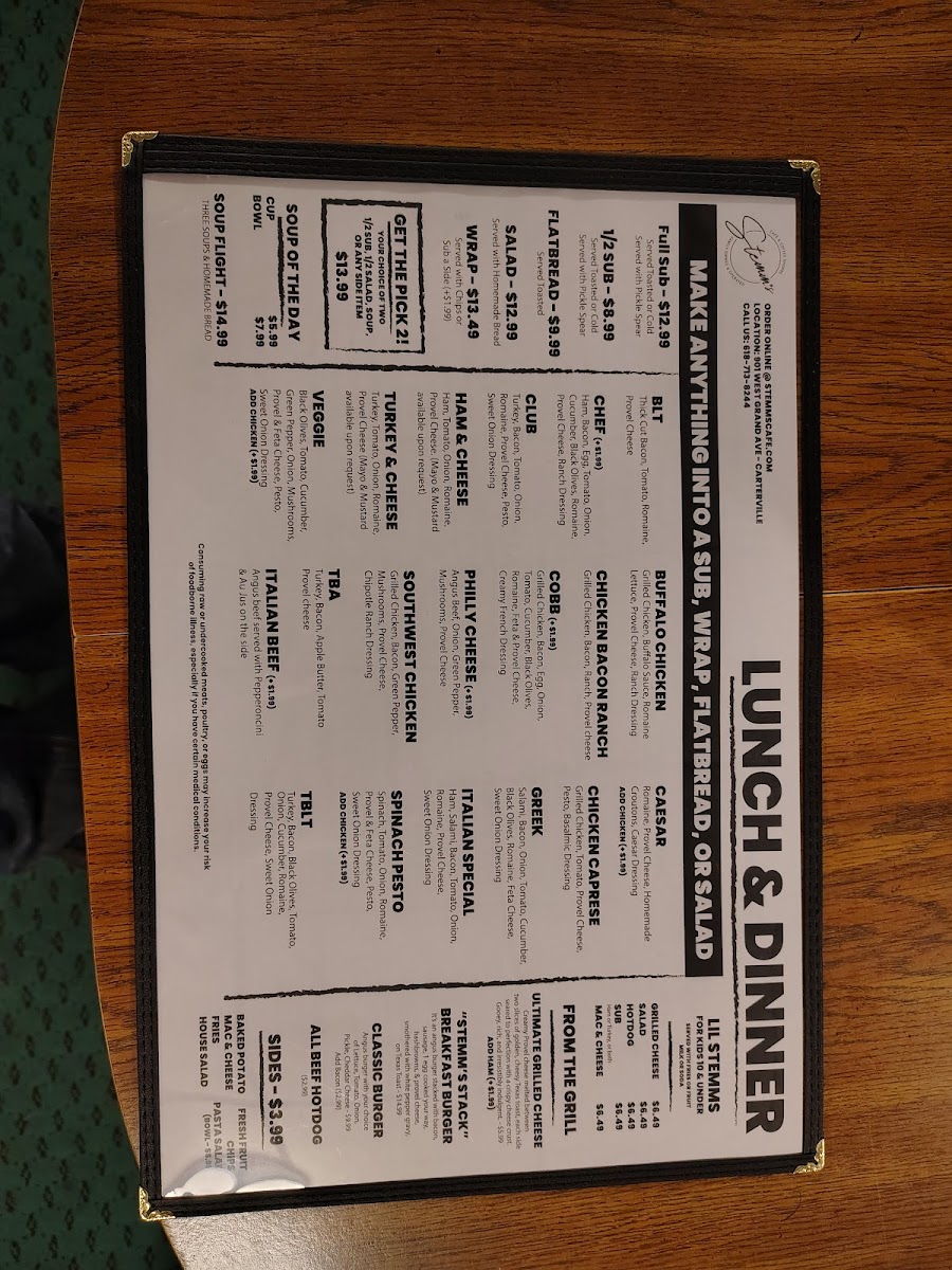 Welcome to Stemm's Cafe & Coffee Shoppe, a culinary gem nestled at 901 W Grand Ave, Carterville, IL. This inviting café offers a diverse menu that caters to every palate. Diners can savor hearty sides like mac & cheese and fries, with prices starting at just $2.49. The drink menu is just as impressive, featuring unique options like a coffee flight and Italian creme soda flight, perfect for any beverage enthusiast.